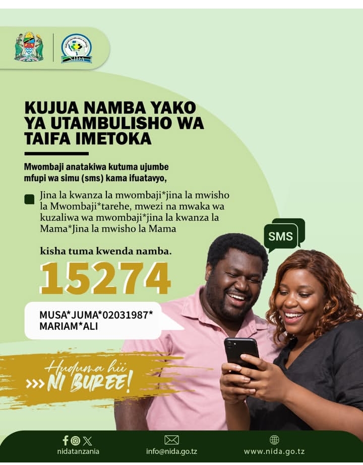 Mamlaka ya Vitambulisho vya Taifa (NIDA) inawataarifu wananchi wote kuwa sasa wanaweza kujua Namba yao ya Utambulisho wa Taifa (NIN) kwa urahisi kupitia ujumbe mfupi wa simu (SMS).
